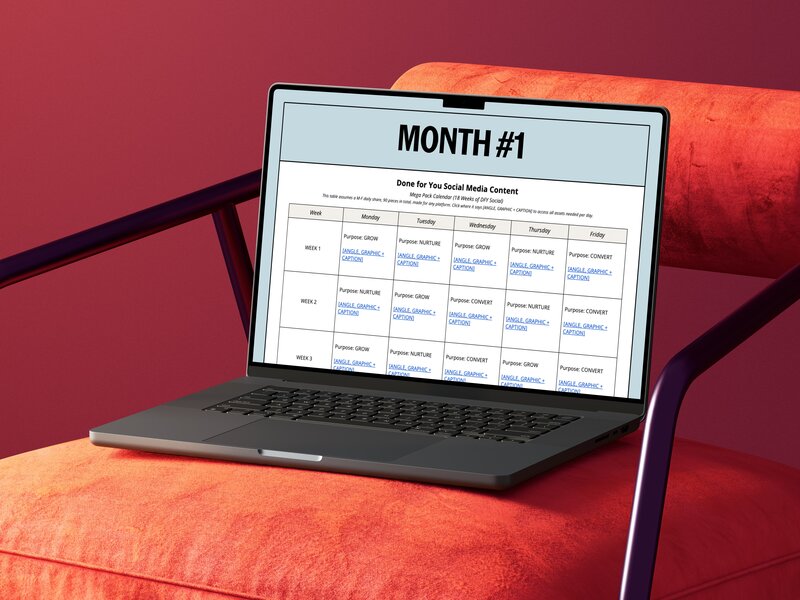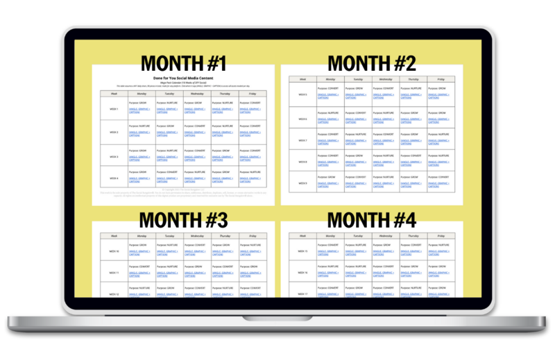 This content calendar interweaves the growth, nurture, and conversion content into a Mon - Fri posting schedule that allows each week to have a strategic theme that consistently attracts and sells.